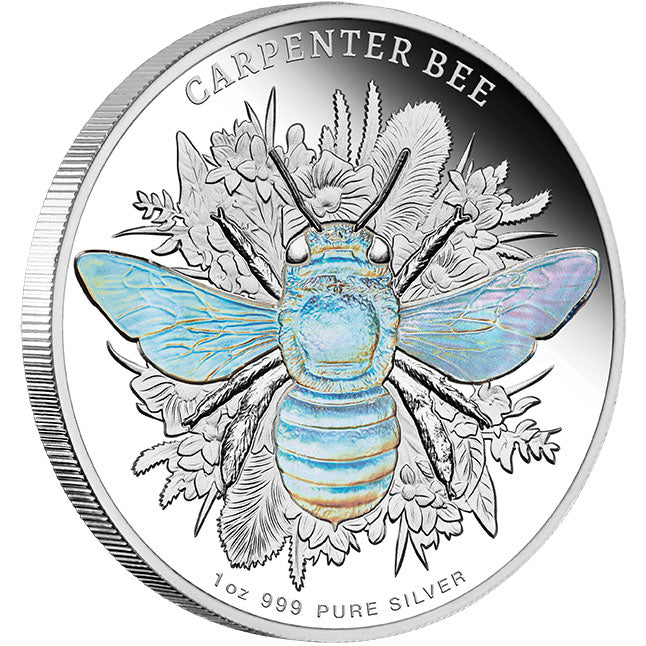 This excellent collector coin, minted from an ounce of 99.9% pure silver, depicts the Carpenter Bee with a very special feature - a blue hologram addition across its wings.
