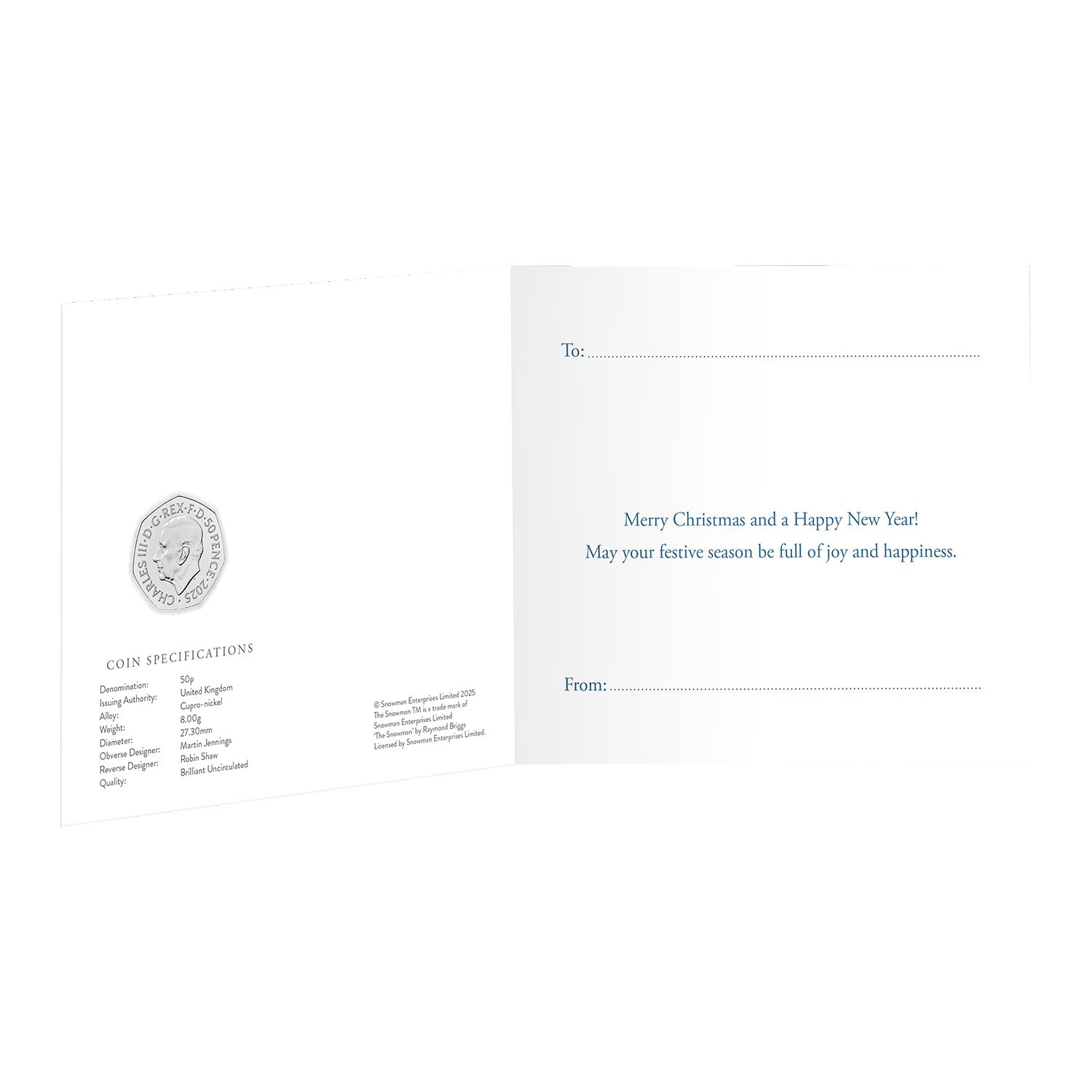 This official UK 50p coin commemorates The Snowman beautifully, and includes an envelope to allow the coin and card to be sent to a loved one with Christmas wishes.
