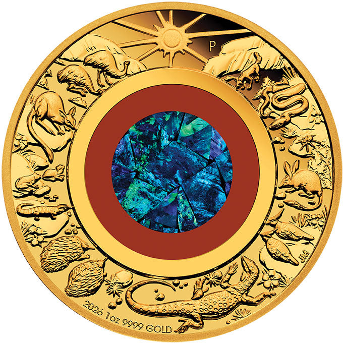 Minted from an ounce of 99.99% pure gold, and incorporating a glorious, colourful opal gemstone at its centre, this beauty depicts a sun with beaming rays, a dingo, a python, a wolf spider, a bilby, two spinifex pigeons, a perentie, two echidnas, a blue tongued skink, two desert tree frogs, a rock wallaby, and two emus. Australia is diverse, to say the least!