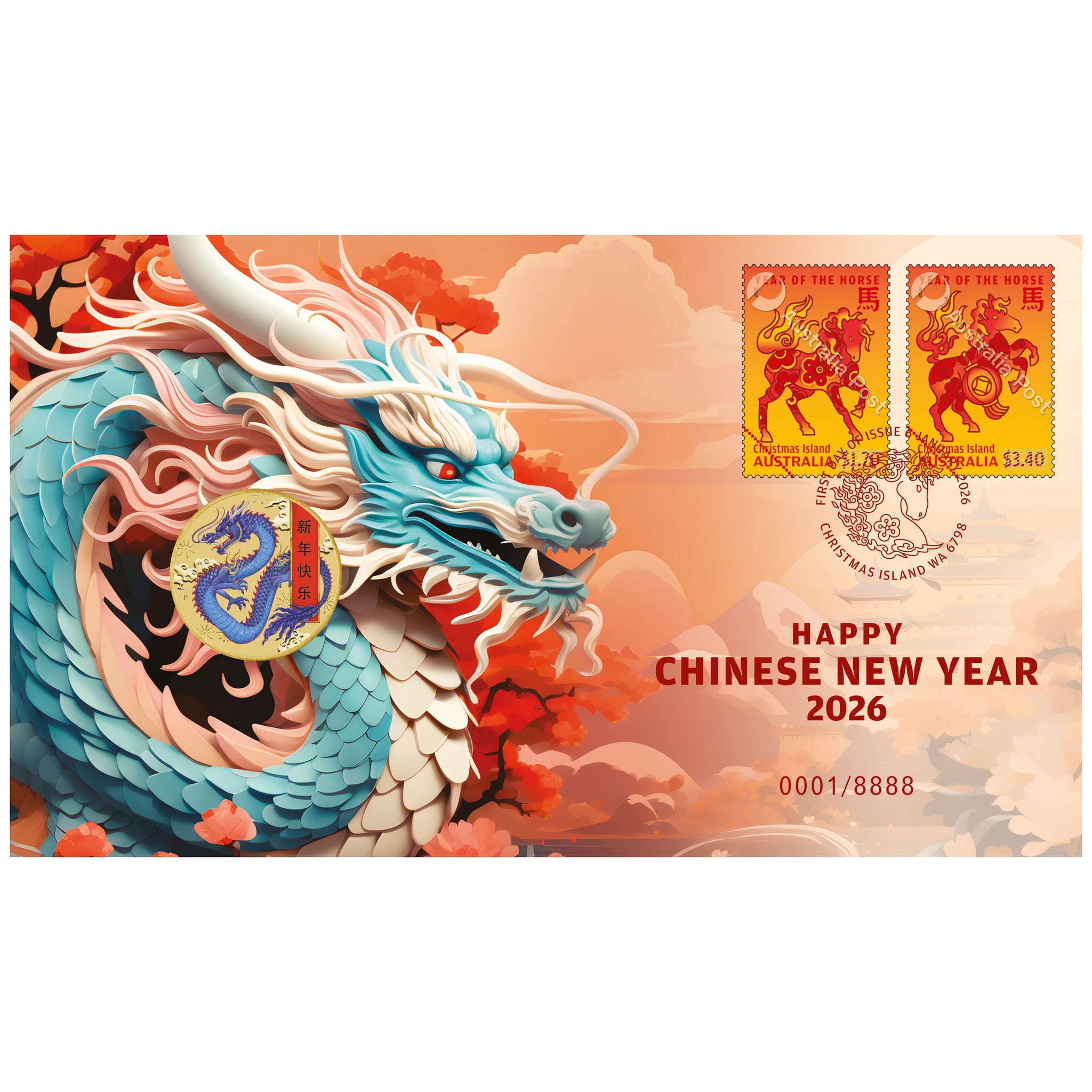 A special joint presentation by Australia Post and The Perth Mint, this Postal Numismatic Cover (PNC) features two official Australian Year of the Horse stamps ($1.50 and $3.00), together with an official Perth Mint Chinese New Year Dragon coin!